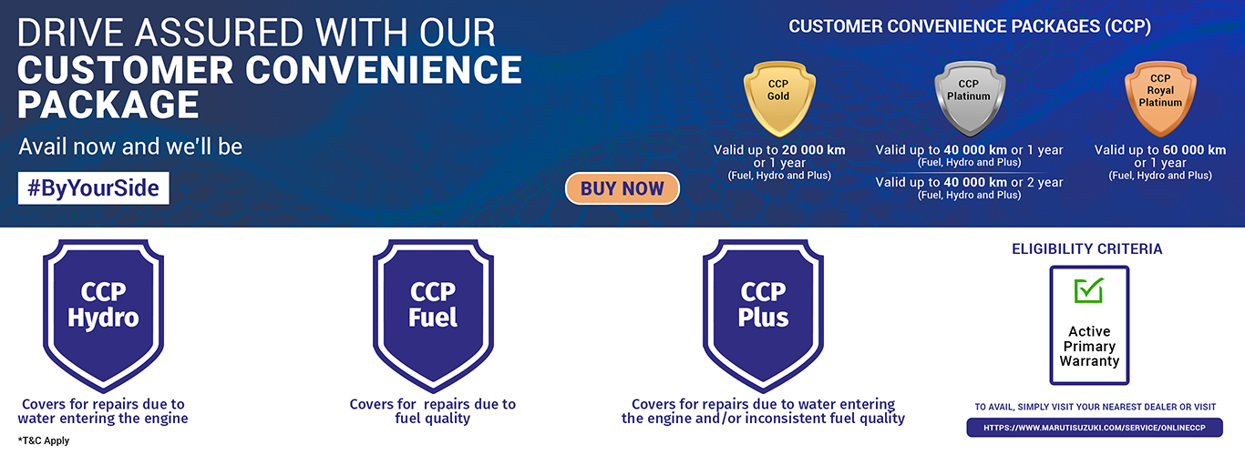 The Maruti Suzuki cars come with a standard 24 months / 40,000 km warranty, for parts & repairs qualified under unforeseen manufacturing defects. With Maruti Suzuki Extended Warranty program, one can avail these benefits for an extended time period. The extended warranty can be availed upto 5 years or 1,00,000 km*. Maruti Suzuki Extended Warranty plans: Royal Platinum 3rd, 4th and 5th year or 1,00,000 km* Platinum 3rd and 4th year* or 80,000 km* Gold 3rd year or 60,000 km* To buy, Maruti Suzuki Extended Warranty, please reach out to Maruti Suzuki Authorized Dealership. * Whichever is earlier
